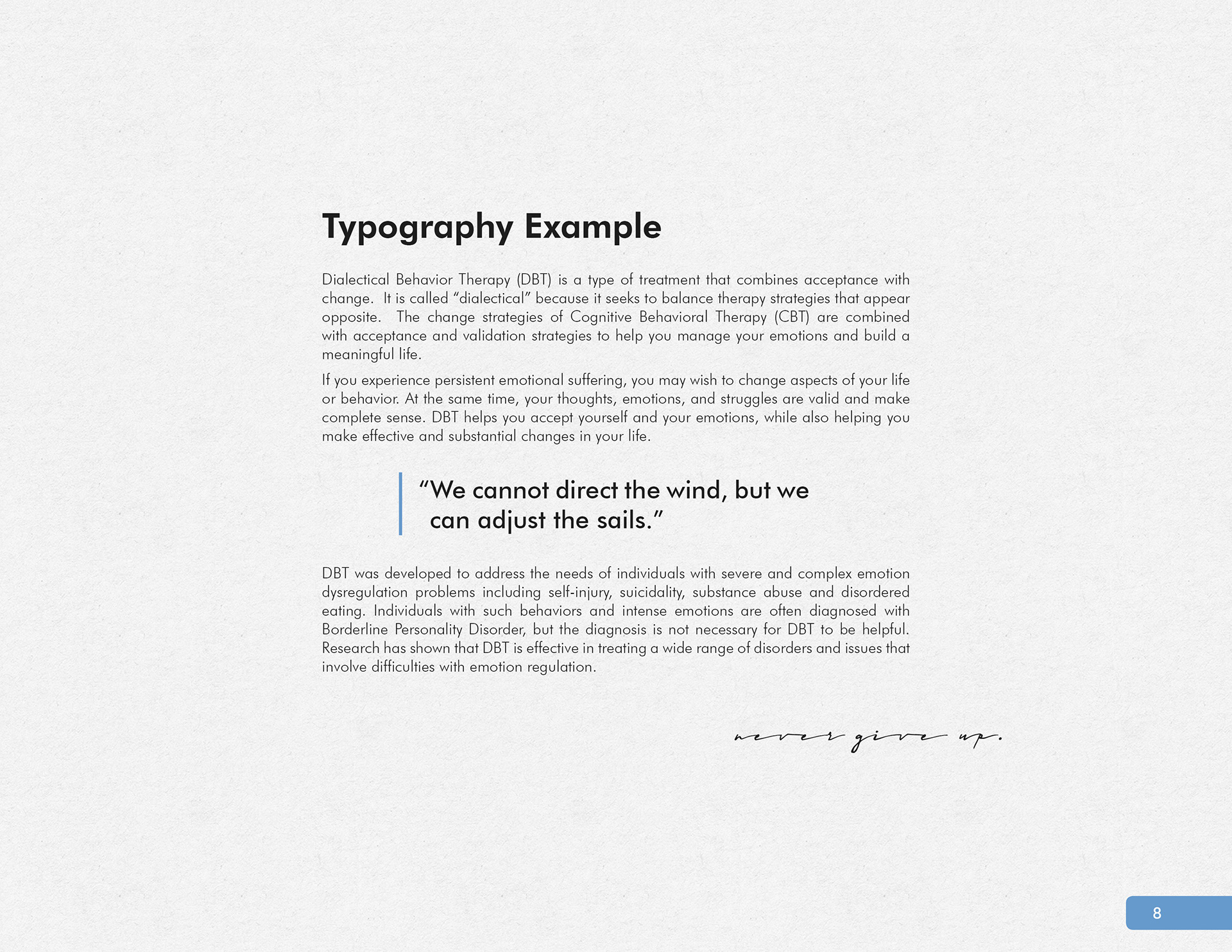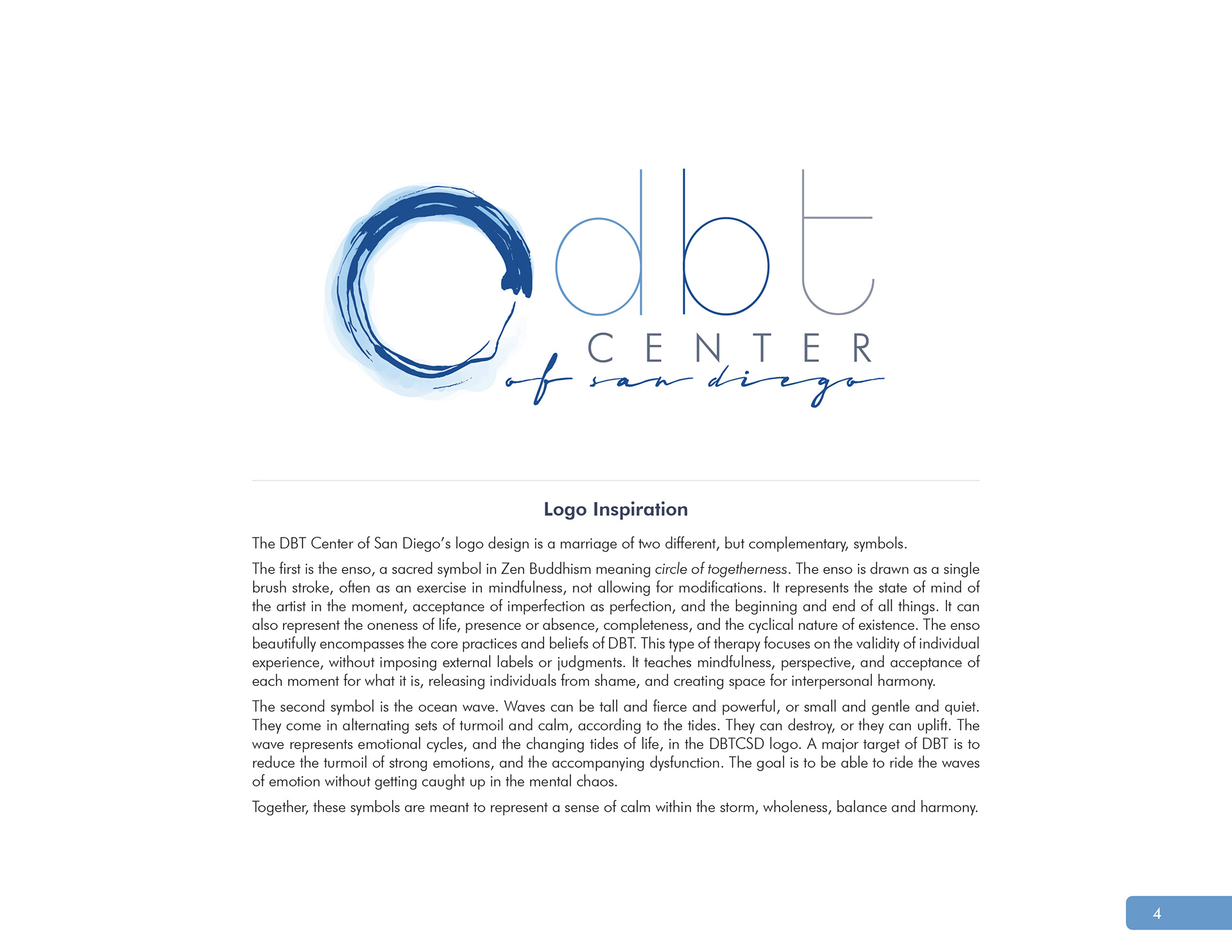 Visual identity and brand style guide created for a therapy clinic in San Diego. Clinic values include compassion, validation and effectiveness, with a focus on using mindfulness to ride the waves of emotion, and improve self-regulation.